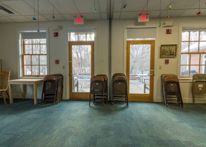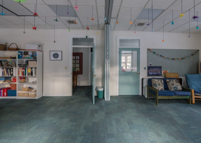 The double classroom, with views to the patio, side yard and forested edges, can be conveniently configured as a single large room or two smaller rooms.